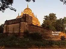 Maharani Ahilya Bai Holkar built the chhatri of Malhar Rao Holkar at Alampur in Bhind district in 1766 A.D. Built on the pattern of the chhatris of Holkar rulers at Indore, the chhatri is famous for its carvings of floral and leaf patterns. The Maratha style chhatri represents a blend of shikhar dome and arch, on which Kalash has been made. The first storey of the chhatri is a pillared hall decorated with paintings. This canopy is located on the left side of the entrance of Alampur. In 1766, Malhar rao Holkar camped here during the battle with Jaat Rulers during which he died here and a canopy was built here in his memory and it is currently known as Malhar Rao Holkar Chhatri. Chatri is built on a 6-foot-high scaffold with a sanctorum in the middle and encompass a path around it founded on the pillars. Colorful carvings are on the roof of the encompassing path and vines are carved on the walls of sanctorum inspired by Iranian Style. Carvings are also on the balcony of the sanctorum (गर्भगृह) with sun on the middle of the north, east and south and a tortoise on the west balcony. Sanctorium remain above the main peak which is oval in shape amra vase (आम्र कलश) at its top. Several other peaks are around the main peak. The sanctorum also has windows all around. The wall on the left side of the canopy has statues of the ruling family with five panels of such. Some statues are also there on the walls of the canopy. At present a trust is looking after the Chhatri.