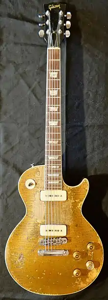 Wilson's mainstay Les Paul Goldtop was not a factory stock model. The stock tuners were replaced sometime prior to Woodstock with modern Grover tuners, as the stock tuning pegs at the time did not keep the instrument in tune as well as later models. In addition, the pick guard and bracket were also removed to provide room for his finger picking style. The model had a stoptail bridge (an adjustable fixed-bridge piece and a separate stopbar or tailpiece) that provided both string support and intonation in one unit. It also featured Gibson P-90 single coil pickups. Both of these latter features were keys to Wilson’s tone.[34]