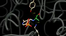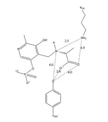 This mechanism is supported by mutations of Arg219. Mutations changing Arg219 to a carboxylate result in a quinonoid intermediate being detected whereas none was detected with arginine.[8] The arginine intermediate has much more free energy, is more unstable, than the acidic residue mutants.[7] The destabilization of the intermediate promotes specificity of the reaction,.[8][9]