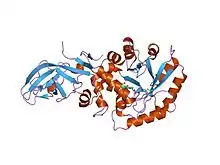 The structure of alanine racemase from Bacillus stearothermophilus (Geobacillus stearothermophilus) was determined by X-ray crystallography to a resolution of 1.9 A.[6] The alanine racemase monomer is composed of two domains, an eight-stranded alpha/beta barrel at the N terminus, and a C-terminal domain essentially composed of beta-strand. A model of the two domain structure is shown in Figure 2. The N-terminal domain is also found in the PROSC (proline synthetase co-transcribed bacterial homolog) family of proteins, which are not known to have alanine racemase activity. The pyridoxal 5'-phosphate (PLP) cofactor lies in and above the mouth of the alpha/beta barrel and is covalently linked via an aldimine linkage to a lysine residue, which is at the C terminus of the first beta-strand of the alpha/beta barrel.