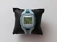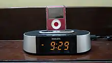 A clock radio is an alarm clock and radio receiver integrated in one device.[18] The clock may turn on the radio at a designated time to wake the user, and usually includes a buzzer alarm. Typically, clock radios are placed on the bedside stand. Some models offer dual alarm for awakening at different times and "snooze", usually a large button on the top that silences the alarm and sets it to resume sounding a few minutes later.[19] Some clock radios also have a "sleep" timer, which turns the radio on for a set amount of time (usually around one hour). This is useful for people who like to fall asleep while listening to the radio.