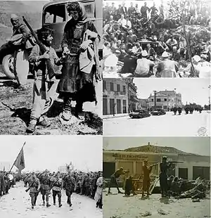 Clockwise from top left: Albanian refugees crossing the border to Yugoslavia in April 12, 1939, Ballists and Communists converse during Mukje Agreement 1943, Italian troops in Durrës, Communist Partisans fighting in Tirana 1944, Partisans march through Tirana after occupying it 28 November 1944