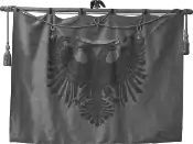 In the spring of 1911, teacher and poet Palok Traboini, then serving as personal secretary to Ded Gjo Luli, while journing through Dalmatia brought along with him three flags[54] and delivered them to Ded Gjo Luli of Hoti, Dok Ujka of Gruda and Prel Luca of Triepshi respectively. The flags had been fabricated in Vienna, Austria at the request of Aladro Kastriota and were a gift for the fighting insurgents of Malësia e Madhe. One of the flags was first unfurled at the Church of Traboini in Hot on 6 April 1911 by Kol Ded Gjoni, son of Ded Gjo Luli and later raised several times by his fighters on top of the Bratila peak.[55] Placed on the flag was a piece of cloth with the inscription "Flamuri i Liris" Mars 1911 and on the carrying spear can be seen the figurine of an eagle with flapping wings. The flag appeared in the form of a labarum, in the style of Roman legions.