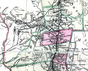 Through the Dongan Charter, Governor Thomas Dongan granted Albany the right to purchase 500 acres (2.0 km2) in "Schaahtecogue" (today Schaghticoke, in Rensselaer County)[16][17] and 1,000 acres (4.0 km2) at "Tionnondoroge" (today Fort Hunter, in Montgomery County).[16][18] Arent van Curler founded Schenectady in 1662; Fort Saratoga was built at present-day Schuylerville in 1691; and Greenbush (present-day city of Rensselaer) was settled in the 1620s. South of Albany, settlement occurred quickly at first, but slowed as growth on the frontier pushed people north and west of Albany and left the southern reaches of the Capital District behind. Hudson, in Columbia County, was purchased from the natives in 1662 by Dutch farmers and speculators but did not see actual settlement and growth until 1783 when New Englanders, mainly from southeastern Massachusetts and Rhode Island, arrived.[19] It was chartered as a city in 1785, becoming only the third city in the state.