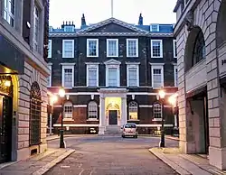 The Albany was built in 1771–1776 by Sir William Chambers for the newly created 1st Viscount Melbourne who had bought the land and residence (Piccadilly House) it was to replace from Henry Fox, 1st Baron Holland for £16,500.[1][2] It was called Melbourne House and cost at least £50,000 to build.[3] It is a three-storey mansion, seven bays (windows) wide, with a pair of service wings flanking a front courtyard.