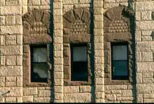 On either side of the loggia is a recessed narrow one-over-one double-hung sash with a blind third pane above. A stone course sets off the arched transom above, framed by a splayed block arch. To the north is a similarly treated wider double window, its tympanum painted with an intricate sunburst design.[12] Around the corner, on the north facade, fenestration of the second story begins with a similarly styled window. To its east is a large quadruple window that echoes the loggia, with the same surrounds around groups of three narrow sash windows topped by two separated panes and tripartite transom under the arches.[10]