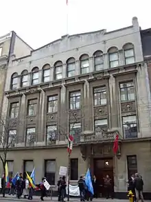 The current clubhouse at 91 King Street East was designed by Charles J. Gibson (1862–1935)[3] and completed in the early 1930s.[4] Its west side is directly adjacent to the last remaining portion[5] of "Victoria Row",[6] which was originally constructed by John George Howard from 1840 to 1842 as a commercial building.[7] The remainder of that site has been redeveloped as part of the 65 King Street East office tower, which preserved the historic facades along King Street.[8]