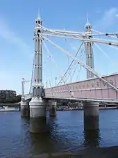Rowland Mason Ordish was appointed to design the new bridge.[10] Ordish was a leading architectural engineer who had worked on the Royal Albert Hall, St Pancras railway station, the Crystal Palace and Holborn Viaduct.[10] The bridge was built using the Ordish–Lefeuvre system, an early form of cable-stayed bridge design which Ordish had patented in 1858.[9] Ordish's design resembled a conventional suspension bridge in employing a parabolic cable to support the centre of the bridge, but differed in its use of 32 inclined stays to support the remainder of the load.[14] Each stay consisted of a flat wrought iron bar attached to the bridge deck, and a wire rope composed of 1,000 1⁄10-inch (2.5 mm) diameter wires joining the wrought iron bar to one of the four octagonal support columns.[15]