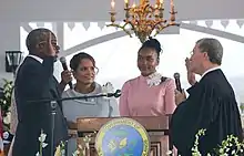 Bryan was sworn in as the 9th governor of the United States Virgin Islands by Rhys Hodge, Chief Justice of the Supreme Court of the Virgin Islands on January 7, 2019, at the David Monsanto Bandstand, which was built by his grandfather Ulric “Sappy” Pilgrim in Emancipation Gardens on St. Thomas. Prior to the ceremony, Bryan and his family attended a inaugural mass at Saints Peter and Paul Cathedral. The inauguration proceed with military parades and inaugural balls held on all three islands.[9]