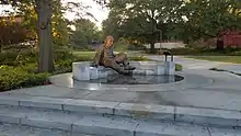 The memorial, situated in an elm and holly grove in the southwest corner of the grounds of the National Academy of Sciences, was unveiled at the Academy's annual meeting, April 22, 1979, in honor of the centennial of Einstein's birth. At the dedication ceremony, physicist John Archibald Wheeler described the statue as "a monument to the man who united space and time into space-time...a remembrance of the man who taught us...that the universe does not go on from everlasting to everlasting, but begins with a bang."[1] The memorial is a popular spot for tourists visiting the national mall to pose for pictures.[2]