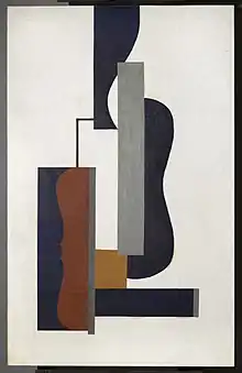 The composition of the Gallery of Living Art was informal and fluid, changing frequently as Gallatin added to his collection or simply wished to revise the display. Somewhat conservative at first, it grew to include major paintings in the cubist, neo-plasticist, and constructivist style by artists such as Picasso, Braque, Gris, Fernand Léger, Piet Mondrian, Jean Hélion, and El Lissitzky as well as ones in the surrealist style by Joan Miró, Jean Arp, and André Masson.[4][5] Gallatin hung the gallery with the few large paintings occupying wall space by themselves. By the mid-1930s, these large paintings included Picasso's Three Musicians (1921), Léger's The City (1919), and Miró's Painting (Fratellini).[32] Most of the collection consisted of small works making it easy for moderately-sized ones, such as Miró's Dog Barking at the Moon (1926) and Mondrian's Composition with Blue and Yellow (1932), to attract the viewer's notice.[2][5] During the 1930s Gallatin continued to receive advice from Jacques Mauny. He also was aided by a succession of friends and acquaintances beginning with Henry McBride (1927–32), followed by Robert Delaunay (1932–33) and then Jean Hélion and George L.K. Morris (1933-ca. 1940). Following his own inclination and their influence, he purged figurative works in favor of abstraction and emphasized non-objective works over ones having identifiable subjects.[2][4][33]