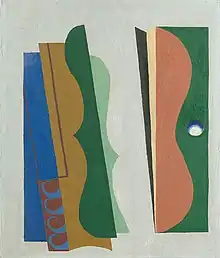During the 1940s Gallatin continued to exhibit his own paintings and organize exhibits of others. In 1942 he put together a show devoted to American women, including Morris's wife, Suzy Frelinghuysen, as well as Alice Trumbull Mason and Esphyr Slobodkina.[4] That same year New York University informed him that he had to close the Museum of Living Art so that the space it occupied could be repurposed as a wartime economy measure. Greatly disappointed, Gallatin accepted an offer from the Philadelphia Museum of Art to provide a home for it. Within a few months 175 works from his collection were moved to Philadelphia and a few were donated to the Berkshire Museum in Pittsfield, Massachusetts, to which Morris and Frelinghuysen were connected.[4][52][53] During the remainder of the 1940s, until his death in 1952, he continued to paint, promote, and collect non-objective art. In 1952 was given a one-man retrospective exhibition at the Rose Fried Gallery, New York.[54] On his death he dispersed his remaining works of art to the New-York Historical Society, the Museum of the City of New York, the National Gallery of Art, and his two sisters.[55] At the end of his life the style of painting that he had championed was falling out of favor as abstract-expressionist art achieved its first critical recognition. Since that time it has regained critical attention and public appeal and is seen at least by some as influencing the minimalist and hard-edge artists who came into prominence in the 1960s[56] as well as younger artists such as Sarah Morris and Mai Braun.[57]