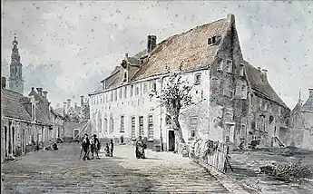 Soon, however, he began participating in local exhibitions and, in 1853, was awarded the "Grote Koninklijke Medaille" for painting.[1] In 1858, his work "Rural Simplicity" won an award from Pictura, the local art society, and he was commissioned to do a series of watercolors depicting the interior and exterior of the Groene Weeshuis, a 17th-century orphanage that was due to be demolished. Three years later, he provided a series of cityscape drawings for the lithographer, Carel Christiaan Antony Last, who published them as the Album der stad Groningen.