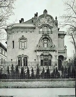 Kőrössy split from Sebestyén in 1899 and built his own house at Városligeti fasor 47 in Budapest, which was heavily influenced by Belgian, French and German Art Nouveau/Jugendstil. Having become proficient in the vocabulary of the style just when it was reaching its apogee elsewhere in Europe, he became a much-sought after designer in Hungary, helping to develop the Szecesszió into a kind of national style alongside many other architects, chief among them Ödön Lechner, who was nearly 25 years his senior. He was known for many residential commissions in Budapest, amongst them the Walko House at Aulich utca 3 (1901); the Sonnenberg twin apartment houses at Alkotás utca 5-7 (1904–05); the Gonda House at Práter utca 9 (1904–05); and the Sonnenberg House at Munkácsy Mihály utca 23 (1904). The latter was a few steps away from the grammar school at Munkácsy Mihály utca 26, now the Kölcsey Ferenc High School (1906–09), one of several schools that Kőrössy designed. Others included the Roman Catholic grammar school (now Unirea Liceum) in Marosvásárhely (now Târgu Mureş, Romania; 1903), and the Royal Hungarian State High School in Budapest, often called the Tündérpalota (Fairy Palace; 1909–11), now the National Pedagogical Library and Museum. In this building one can see the influence of Károly Kós and the Szecesszió architects interested in folk and vernacular themes and handcraft.[8]