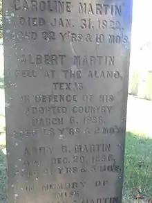 Albert Martin Fell at the Alamo, Texas, In Defense of his country March 6, 1836, Aged 28 yrs & 2 mo's.[8][9]