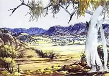 Namatjira was introduced to western-style painting through an exhibition by two painters from Melbourne, Rex Battarbee and John Gardner, at his mission in 1934.[6] Battarbee returned to the area in the winter of 1936 to paint the landscape, and Namatjira, expressing an interest in learning to paint, acted as his cameleer and guide to show him local scenic areas. Battarbee showed him how to paint with watercolours.[6]