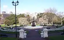 The design of the park was the result of a public competition and follows a formal layout with a main north-south axis. To the north of the axis is a bronze statue by Francis J Williamson of Queen Victoria (1897); to the south is a bandstand (James Slator 1901). Between them is a large cast iron fountain imported from Great Britain in 1881 which forms the centrepiece of the park. The fountain is distinguished by statues of dolphins ridden by cherubs blowing horns that spout water. The fountain is surmounted by Aphrodite that also has a horn spouting water.