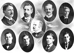 With the growing popularity of intercollegiate athletics in the early 1890s, the University of Michigan faculty in 1894 established a faculty Board in Control of Athletics.[11] Pattengill was a member of the Athletic Board from the time of its formation,[2] serving as its chairman from 1898 until the time of his death.[12][13][14][15][16][17] He was also one of the leaders in the formation in 1896 of the Western Inter-Collegiate Athletic Conference (later known as the Big Ten Conference). The conference was composed of representatives from the athletic boards of seven leading Mid-Western universities, established with the goal of regulating and standardizing the conditions of inter-collegiate athletics and "to maintain a high ideal of amateurism in college sports."[11] Professor Pattengill worked with Michigan's President James B. Angell on the formation of the conference and served as Michigan's faculty representative to the conference.[11] He also served as Chairman of the Western Conference for a number of years.[18]