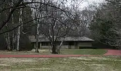 This house is built on a long, 2.5-acre (1 ha) lot and set back well from the road at the end of a long, winding drive.[1] The lot has a deep, wooded ravine at one end. The house sits at the rear of the lot, overlooking the ravine, and faces south/southeast to take maximum advantage of natural light.[3]