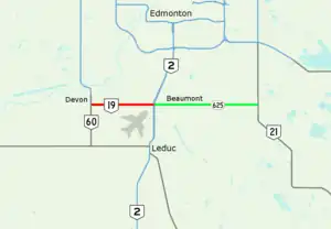 Highway 19 and Highway 625 are two provincial highways south of Edmonton in the Canadian province of Alberta that form a continuous east–west route connecting Highway 60 near Devon to Highway 21 east of Beaumont. Highway 19 was acquired by the City of Edmonton in the land annexation approved by the Province in 2019. Highway 19 passes north of the Edmonton International Airport and, in tandem with Highway 60, provides a southwest bypass of Edmonton between Highways 2 and 16. East of Highway 2, Highway 19 becomes Highway 625 and continues through Nisku Industrial Park. It intersects Highway 814 in Beaumont before ending at Highway 21.