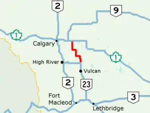 When Highway 24 meets Highway 547 westbound, it turns east and passes the Hamlet of Mossleigh. At Highway 547 eastbound it turns south for 20 km (12 mi) to its end at the junction of Highway 23 and Highway 542 north of Vulcan.[2][1]