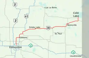 Alberta Provincial Highway No. 28, commonly referred to as Highway 28, is a highway in north-central Alberta, Canada that connects Edmonton to Cold Lake. It begins at Yellowhead Trail (Highway 16) in Edmonton as 97 Street NW, running through the city's north suburbs before entering Sturgeon County and passing CFB Edmonton. After merging with Highway 28A near Gibbons it winds through agricultural lands of north-central Alberta, roughly paralleling the North Saskatchewan River until Smoky Lake before continuing east through St. Paul County to Bonnyville.[2] It turns northeast to CFB Cold Lake, before ending at Lakeshore Drive in the city of Cold Lake shortly thereafter.[3]