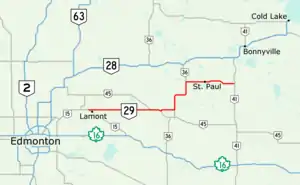 Alberta Provincial Highway No. 29, commonly referred to as Highway 29, is a 153-kilometre (95 mi) highway in east–central Alberta, Canada that connects Highway 15 near Lamont to Highway 41 north of Elk Point. It runs mostly west to east across aspen parkland through Hairy Hill, turning north through Duvernay, Brosseau, Foisy, St. Brides, and east to St. Paul before ending at Highway 41 approximately 9 km (5.6 mi) north of Elk Point, concurrent with Highways 36 and 45 for lengthy sections.