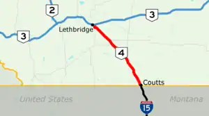 Interstate 15 becomes Highway 4 as it crosses the international border between Montana and Alberta into Coutts, the only border crossing between Montana and Alberta that is open 24 hours year-round.[3] The highway curves north out of Coutts alongside the railway to a three-way intersection with Highway 501 which leads west to Del Bonita. The two highways continue concurrently to the north, briefly paralleling Milk River. The concurrency ends and Highway 501 splits to the east into the community of Milk River, becoming Railway Street, while Highway 4 continues north across the river to bypass the town.[5][6]