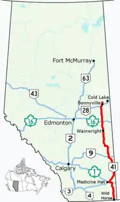 Alberta Provincial Highway No. 41, commonly referred to as Highway 41 and officially named Buffalo Trail, is a 686-kilometre (426 mi) north-south highway in eastern Alberta, Canada. It extends from the United States border at Wild Horse to Highway 55 in the hamlet of La Corey north of Bonnyville.[2]