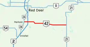 Alberta Provincial Highway No. 42, commonly referred to as Highway 42, is a 44-kilometre (27 mi) highway in central Alberta, Canada that connects Highway 2A in Penhold, about 9 kilometres (6 mi) south of the city of Red Deer, to Highway 21 near the Hamlet of Lousana.[2][1]