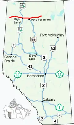 Alberta Provincial Highway No. 58, commonly referred to as Highway 58, is an east–west highway in northwest Alberta, Canada.[2] It starts west of the Rainbow Lake Airport and passes through the towns of Rainbow Lake and High Level before it ends at the Wood Buffalo National Park boundary west of Garden River.[1][3]