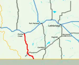Alberta Provincial Highway No. 6, commonly referred to as Highway 6, is a north-south highway in southern Alberta, Canada. It spans approximately 74 kilometres (46 mi) from Alberta's border with Montana to Highway 3 (Crowsnest Highway).[2][3]