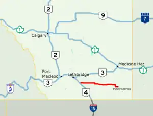 | County of Warner No. 5 | Stirling | 0.0 | 0.0 | Red Coat Trail follows Hwy 4 north | |
