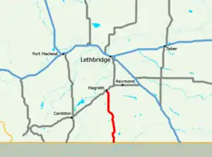 Alberta Provincial Highway No. 62, commonly referred to as Highway 62, is a 52-kilometre (32 mi) north–south highway in southern Alberta, Canada that connects Highway 5 in Magrath to the Canada–United States border south of Del Bonita. It continues as Montana Secondary Highway 213 in the United States.[1][2][3]