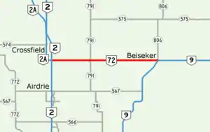 At its west end, Highway 72 begins at its intersection with Highways 2 and 2A at Exit 295 southeast of the Town of Crossfield and ends at Highways 9 and 806 at the Village of Beiseker. The entire stretch of Highway 72 is in Rocky View County.[1][2]