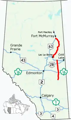 Alberta Provincial Highway No. 881, commonly referred to as Highway 881, is a highway split into two sections in northeast Alberta, Canada. Each section is over 200 kilometres (120 mi) in length; the southern portion runs from Highway 13 in Hardisty to Highway 55 northwest of Bonnyville, while the northern section stretches from Highway 55 in Lac La Biche to the south side of Fort McMurray, serving as an important alternate route to Highway 63.[3] A 72-kilometre (45 mi) section of Highway 55 joins the two sections. Lac La Biche County is lobbying the Government of Alberta to renumber the section of Highway 881 between Lac La Biche and Fort McMurray to Highway 36.[4]