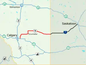 Alberta Provincial Highway No. 9, commonly referred to as Highway 9, is a highway in south-central Alberta, Canada, which together with Saskatchewan Highway 7 connects Calgary to Saskatoon, Saskatchewan via Drumheller. It is designated as a core route of the National Highway System, forming a portion of an interprovincial corridor.[2] Highway 9 spans approximately 324 km (201 mi) from the Trans-Canada Highway (Highway 1) east of Calgary to Alberta's border with Saskatchewan.[1][3][4]