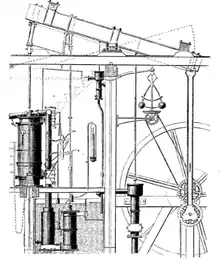 The building was designed by the architect Samuel Wyatt.[2] The engines were supplied with water taken directly from the River Thames.[3] At the time, they were "the most complete and powerful which had been produced by the Soho Manufactory". The mill's wheels and shafts were made of iron. An exception to this were some of the cogs, which were of hard wood, though others were of cast iron, as were the pinions. The teeth, some of wood and others of iron, were manufactured by chipping and filing into epicycloidal shapes. The shafts and axles were made of iron and the bearings of brass.[4] The mill's double engine, producing 50 horsepower (37 kW), drove 20 pairs of millstones, each grinding some nine bushels of corn an hour.[5] It also provided power for raising corn, fanning it to free it of impurities, sifting it, dressing the meal and lowering it into the barges, which made the process more efficient.[4]
