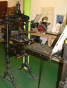 After Cope's death, Albions were manufactured by his heirs and members of the Hopkinson family (trading initially as 'Jonathan and Jeremiah Barrett' and later as 'Hopkinson and Cope'), who are said to have improved the design. From the 1850s onwards Albion presses were manufactured under licence by other firms, notably Harrild & Sons, Miller and Richard, and Frederick Ullmer Ltd.[2][3] The toggle-action, and the distinctive shape and 'crown' finial of the Albion, make it instantly recognizable.