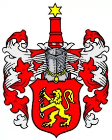 The family's coat of arms features in red a golden lion that breaks a silver chain.