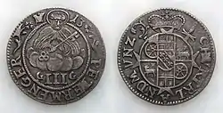 On the obverse there were initially Christian motifs, depictions of Christ and the saints. In Trier, from 1625, the albus was also known as the Petermenger (Petermännchen or "Little Peter") because it portrayed Saint Peter on the obverse. This version was distributed in huge quantities until 1689 and spread across the whole of western Germany to Westphalia, Thuringia and Brandenburg. On the reverse, the coins usually depicted the coat of arms of the originating city; in Mainz, for example, the Wheel of Mainz, the so-called Raderalbus, which was worth 24 pfennigs i.e. a double schilling. The design also changed over time. From 1689 the image of St. Peter was replaced by the "three-peter man" (Dreipetermännchen). This coin was very successful and soon became a coveted means of payment as far as the River Elbe in the east. The Dreipetermännchenremained in circulation in many variants until 1715. In 1760, minting was resumed by the Koblenz Mint. The inscription III PETERMENGER was replaced by 24 ONE MARCK FEIN SILBER, since it was supposed to be worth 6 kreuzers.[4]