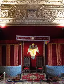 King Henry IV's decision to incorporate a gallery that depicted various rulers of Castile and León, in seated positions, into the hall's decoration was designed to demonstrate the political legitimacy of those in power during 15th century Spain. Similar imagery can be found in the King’s Hall (Sala de los Reyes) (also sometimes identified as the Hall of Justice) at the Alhambra, where an image of ten seated rulers located in the ceiling vault are believed by some scholars to represent different emirs from the Nasrid dynasty.[13] Other scholars, however, have argued that due to the presence of small coats of arms below the figures and at the two ends of the image, the scene likely represents the ruler, in this case, Muhammad V of Granada (r. 1354–1359), accompanied by a group of wise men, various teachers and literary figures, is a meeting known as a maŷlis.[11] Whoever is illustrated in the imagery in the Alcázar of Segovia's Hall of Kings, the message concerns the representation of political power, dominance, and legitimacy.[11]