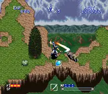 Alen is capable of attacking enemies using a blade bestowed on him by the Guardians; After specific boss fights, the player gains the abilities of one of the four Guardians (based on the four classical elements). Alen can also charge his blade for a special attack, which differ depending on the elemental Guardian selected. MP is used to summon Guardians in battle. The player can swap between each Guardian by pressing the shoulder buttons.[3][4][5][8] Alen can also perform dash attacks when running by double-tapping the d-pad, as well as block projectile attack by standing still with his shield.[3][4] Along the way, Alen meets five allies that join him at predetermined points of some stages. They are the young wizard Garstein, the princess Elikshil, the knight Sirius, the android Magna and the shape-shifting dragon goddess Nevis. Though they cannot be controlled directly, allies attack and use special moves when the corresponding button is pressed. "Special Points" (SP) is required for a partner's special attack.[3][4][5][9]