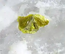 ![]() Alcantarillaite. Section of a spherule showing laminar crystals, on quartz. Alcantarilla Mine, Belalcázar (Córdoba) Spain. Width, 1.5 mm | |