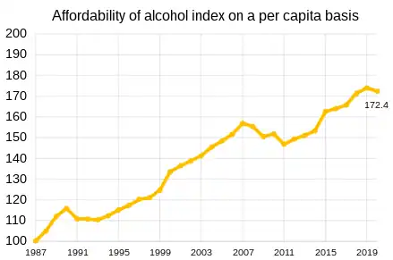 In 2004, alcohol consumption peaked at an all time high of 11.6 litres[10] which was around double than in 1954.[9][11]