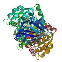 The first-ever isolated alcohol dehydrogenase (ADH) was purified in 1937 from Saccharomyces cerevisiae (brewer's yeast).[14] Many aspects of the catalytic mechanism for the horse liver ADH enzyme were investigated by Hugo Theorell and coworkers.[15] ADH was also one of the first oligomeric enzymes that had its amino acid sequence and three-dimensional structure determined.[16][17][18]