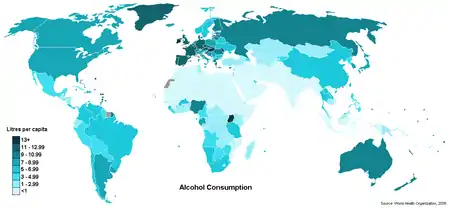 Alcohol is commonly consumed and available at pubs and liquor stores in Australia – all of which are private enterprises. Spirits can be purchased at liquor stores and pubs, whereas grocery stores do not sell them, although they may have separate liquor stores on their premises. Alcohol consumption is higher, according to WHO studies, than in most European countries and several Central Asian and African countries, although consumption is just as high in Australia as in North America.[1] After tobacco, alcohol is the second leading preventable cause of death and hospitalisation in Australia.[2]