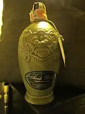 Also in the Minahasa region, the people drink a highly alcoholic drink called cap tikus (lit. "rodent brand"). Cap tikus is made from distilled saguer or sopi (palm wine), which increases its alcohol content. The origin of cap tikus brand is unclear. It is suggested that circa 1820s, prior to the 1830 Java War, the KNIL Minahasan legion found and bought distilled saguer or sopi sold in blue bottles embossed with the image of mouse sold by a Chinese merchant in Fort Amsterdam in Manado.[14] Today however, because of poor regulation on alcohol production in this region, this traditional home-made cap tikus industry is considered as an illegal beverage, due to the high prevalence of mortal alcohol poisoning.[15]