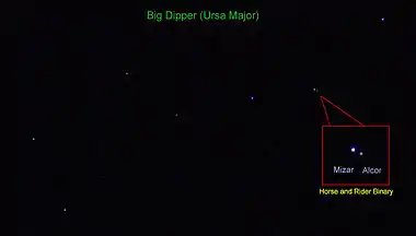 Mizar and Alcor are two stars forming a naked eye double in the handle of the Big Dipper (or Plough) asterism in the constellation of Ursa Major. Mizar consists of two stars with magnitudes 2.2 and 3.9 that can be seen easily without the aid of a telescope. Mizar's star is not a double star, but a four-star binary system located in the constellation Ursa Major (also known as the Big Dipper). This system consists of two pairs of double stars that are gravitationally bound to each other. Mizar is the second star from the end of the Big Dipper's handle, and Alcor its fainter companion. The traditional name Mizar derives from the Arabic المئزر miʼzar meaning 'apron; wrapper, covering, cover'. Alcor was originally Arabic سها Suhā/Sohā, meaning either the ‘forgotten’ or ‘neglected’ one; notable as a faintly perceptible companion of Mizar. Mizar, also designated Zeta Ursae Majoris (ζ Ursae Majoris, abbreviated Zeta UMa, ζ UMa), is itself a quadruple system and Alcor, also designated 80 Ursae Majoris (80 UMa), is a binary, the pair together forming a sextuple system. In fact, it was the first known binary star system, discovered by Italian astronomer Giovanni Battista Riccioli in 1650. The whole system lies about 83 light-years away from the Sun, as measured by the Hipparcos astrometry satellite.[1][2][3]