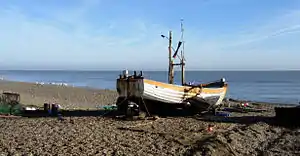 Aldeburgh is notable for its line fishing for amateur anglers; it has been called "a great spot for bass, flounders, sole, dabs, cod, whiting and eels".[60] However, the East Anglian Daily Times says "countless years of commercial over-fishing has all but destroyed many of our [Suffolk's] offshore sea fisheries"[60] and traditional, sustainable inshore fishing is under threat, with likely knock-on effects for the coastal community.[61] Local fishermen featured in the "Fish Fight" campaigns of Hugh Fearnley-Whittingstall and Greenpeace, supporting small-scale inshore fishermen.[62][63]